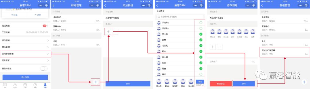 如何创建群组,团队长可以在“CRM小程序-我的-公海群组管理”模块中添加成员组成群组,在您导入客户的时候可以选择指定群组,而且群组员工释放客户时候也可以选择释放到指定群组中与成员共享,让您团队管理避免数据外泄尴尬问题。(提示:默认公司及部门群组不可编辑;解散群组时需要先释放群组内数据)